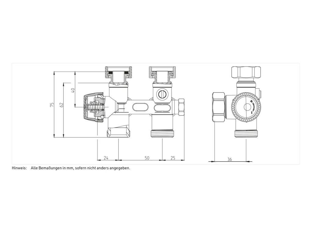 Regulační a uzavírací šroubení Therafix (H-blok) přímé/rohové (univerzál pro vývody z podlahy/ze zdi) s vestavěným termostatickým ventilem (kuželka VS), připojení potrubí 3/4", připojení otopného tělesa 1/2" nebo 3/4", dekorační kryt pochromovaný