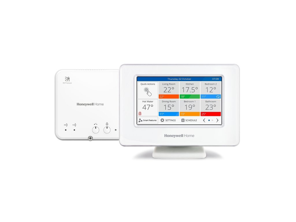Kompletní sada Honeywell Evohome přináší inteligentní regulaci vytápění a chlazení s možností rozšíření až na 12 zón. Obsahuje centrální řídicí jednotku evotouch-WiFi RED3, stolní napájecí konzoli ATF800 a 2kanálovou ovládací jednotku R9H.