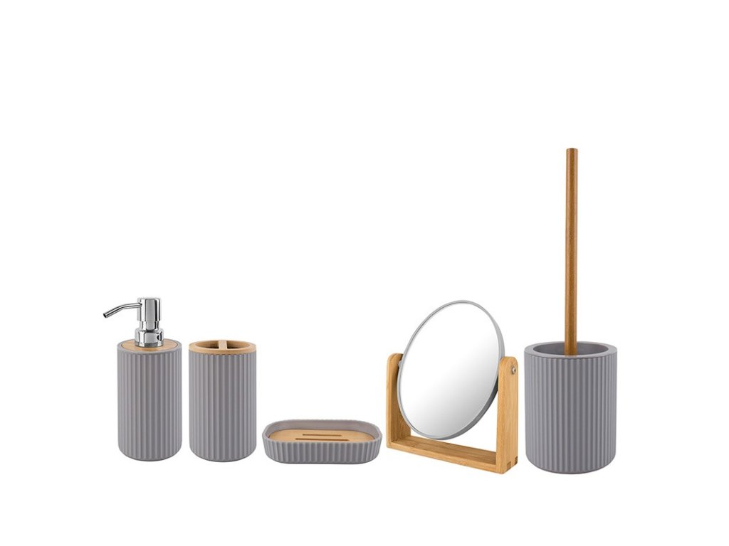 Sérii RAYAON je tvořena kelímkem na zubní kartáčky, mýdelníkem, WC štětkou, kosmetickým zrcátkem a dávkovačem mýdla.