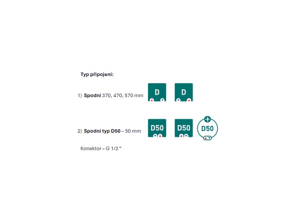 - připojení radiátoru spodní středové D50, jednobodové nebo na rozteč