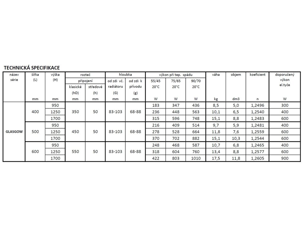 Dostupné rozměry a typy připojení radiátoru GLASGOW: