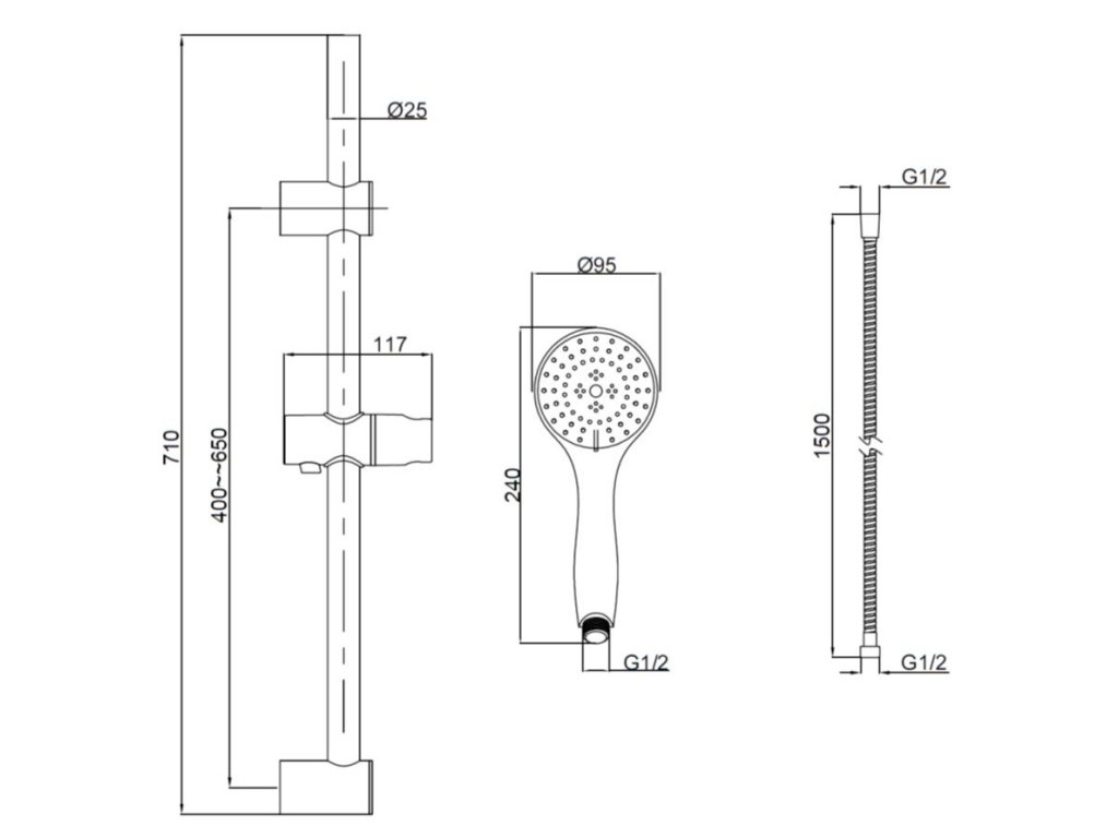 - Příslušenství: sprchová hlavice, hadice, posuvný držák sprchy, instalační materiál