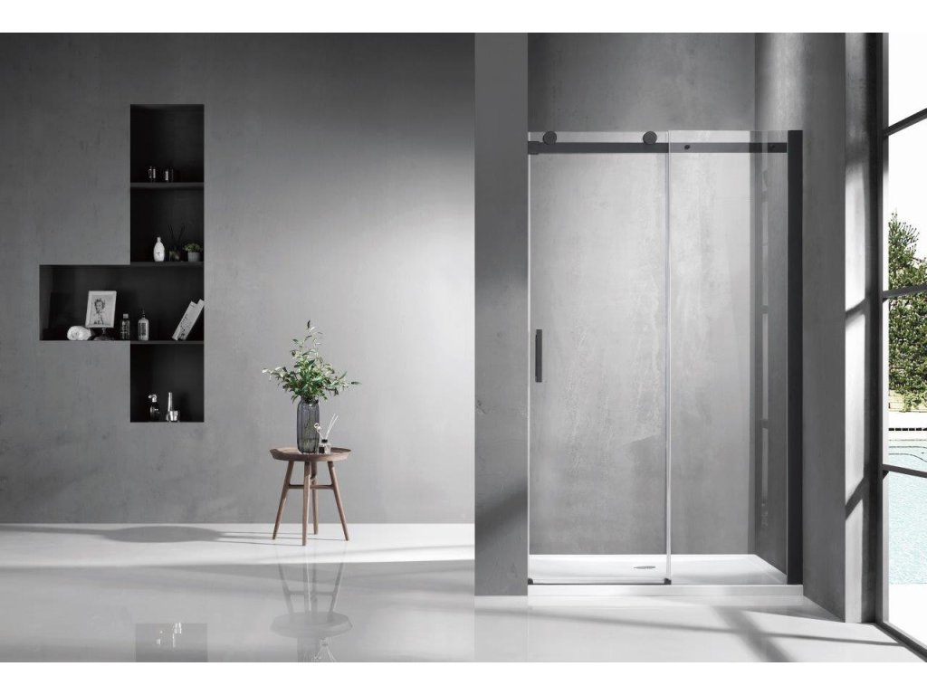 Luxusní skleněné posuvné dveře do niky v kvalitní černé barvě hliníkových profilů. Plynulý a komfortní pohyb dveří zajišťují horní masivní bezúdržbová ložisková kola a spodní vodící díl. Díky absenci spodního vodícího profilu, vzniká ideální bezbariérový vstup do sprchy. Tyto dveře jsou vyrobeny ze skel o síle 8 mm. Dodává se v univerzálním pravém i levém provedení.