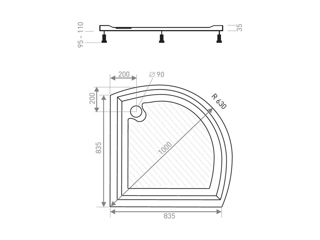 - Akrylová vanička samonosná: R630, 90 x 90 x 16 cm, včetně sifonu (pr. otvoru pro sifon 90 mm)