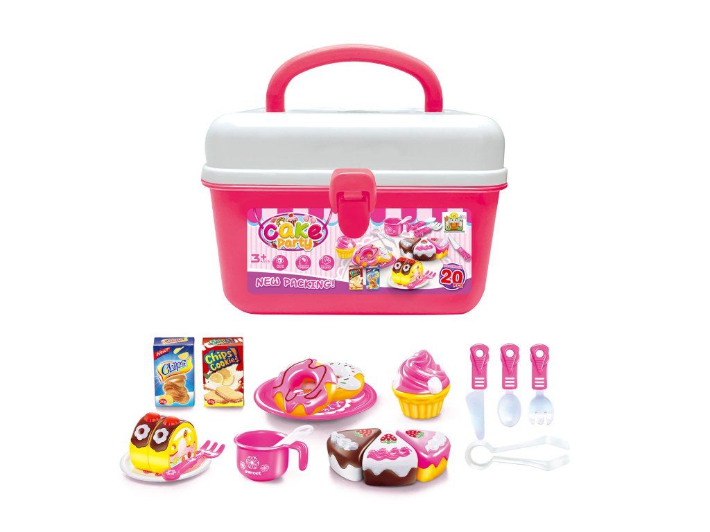 V kufříku najdete krásné barevné plastové dortíky, donuty, rolády, krabičky s ingrediencemi, nádobí i příbory. Zkrátka vše, co je v krámku s dobrotami potřeba. Součástí kufříku je také držadlo, díky kterému může mít vaše malá cukrářka svůj krámek s dortíky u sebe i na cestách.