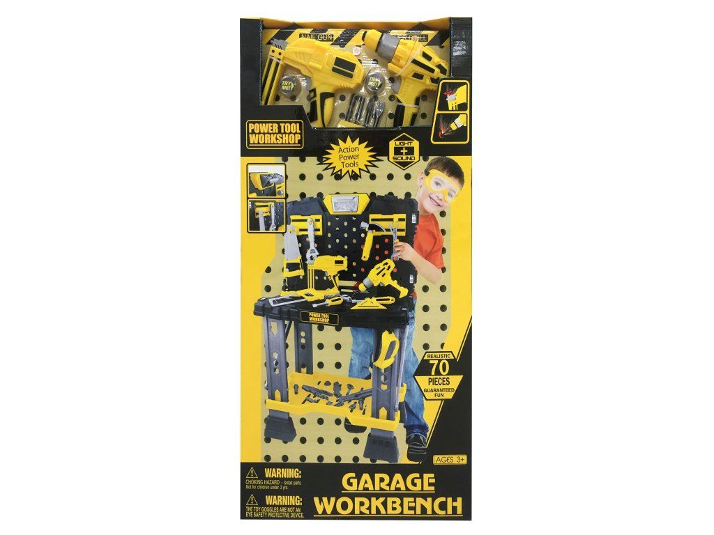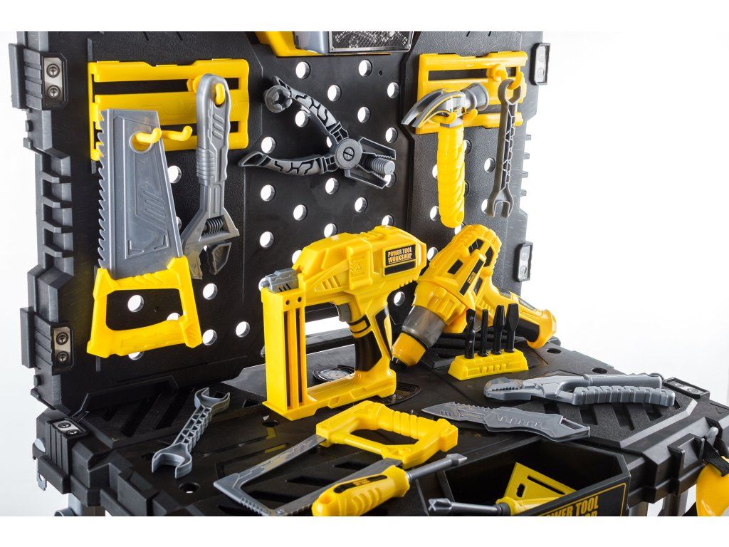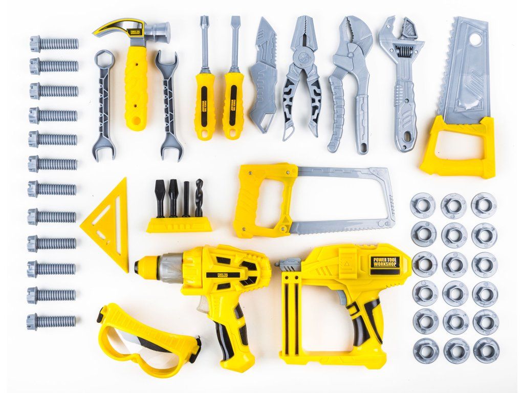 Sada nářadí G21 ukrývá celou dílnu! Touto krabicí plnou nářadí zaručeně potěšíte každého malého domácího kutila. Set obsahuje přesnou kopii nářadí, které má ve své dílně tatínek nebo dědeček. Navíc k nářadí dostanete i vlastní pracovní stůl s odkládacím prostorem a šroubovací deskou.V sadě najdete vrtačku s vrtáky, hřebíkovačku, klíče, šroubky, matky, kladivo, šroubovák, pily, podložky na vrtání, metr, úhloměr, kleště, ochranné brýle a mnoho dalšího. Zkrátka vše, co je v dílně potřeba. Hra s nářadím zlepšuje dětem motoriku, cvičí jejich trpělivost a hlavně jim přinese spoustu zábavy.