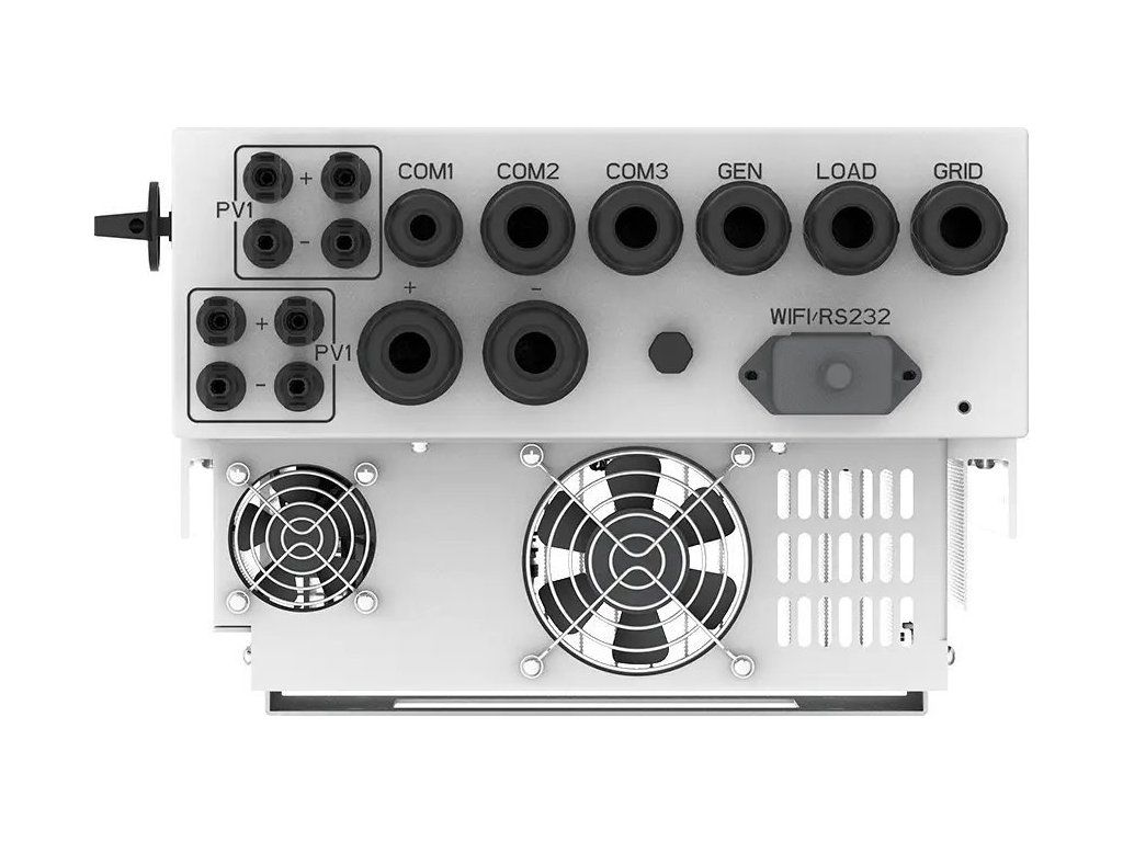 Hybridní měnič 3,6 kW, 1f, 90 A, baterie 40–60 V, IP65, 4 ms, RS485/CAN, Smart Load, 10 let záruka.