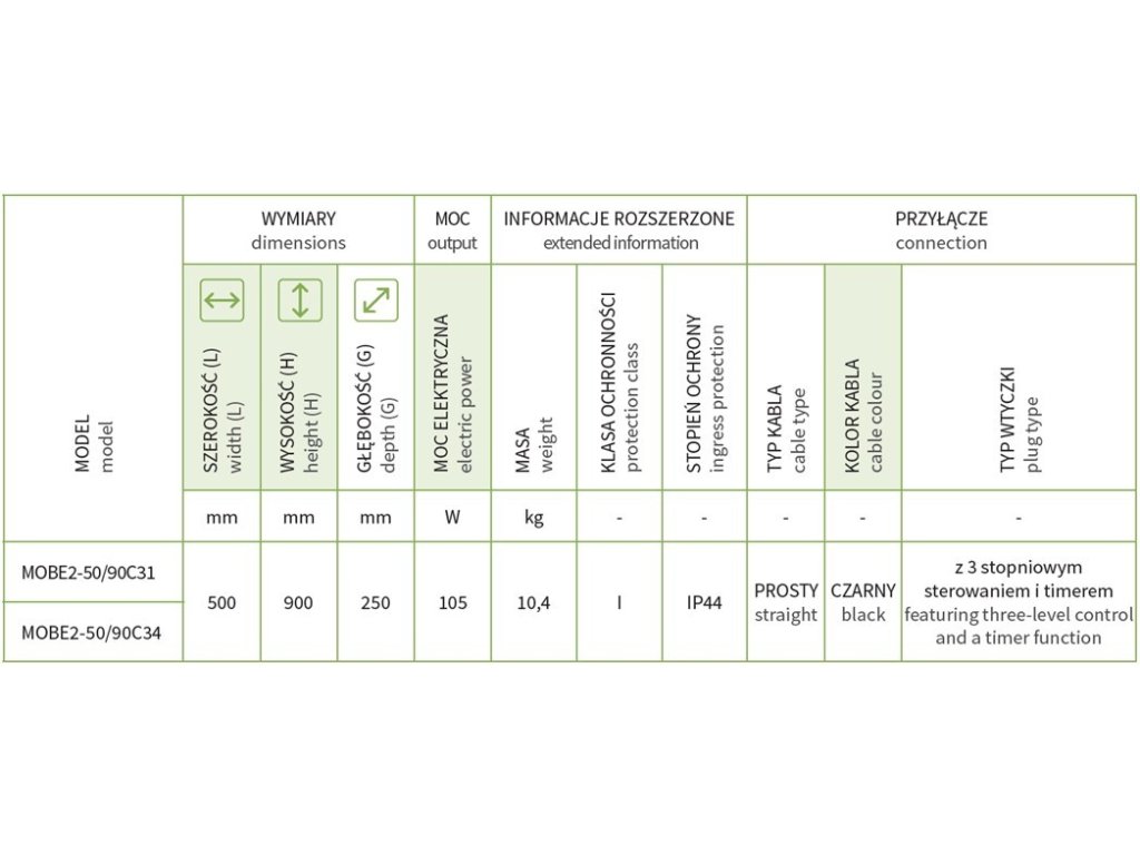 - 500 × 900 x 250 mm (šířka x výška x hloubka), příkon 105 W