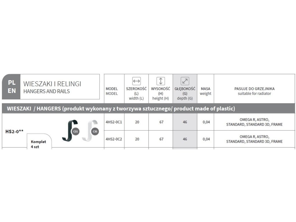 Určeno pro vybrané koupelnové radiátory. Háčky HS2 jsou vyrobeny ze speciálního plastu, buď v bílé nebo černé barvě (balení po 4 ks).