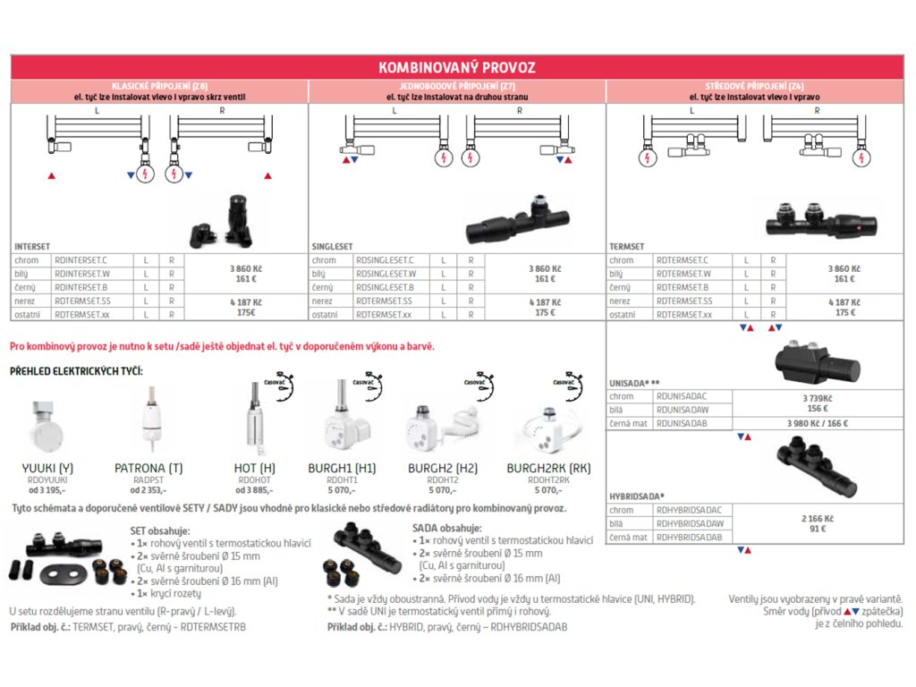Radiátor lze objednat s příplatkovou výbavou Příplatek - Elektrický radiátor a díky tomu dostanete čistě elektrický radiátor (s již osazenou topnou tyčí HOT a naplněný speciální nemrznoucí teplonosnou směsí do otopných těles). Elektrické radiátory nejsou připojeny na rozvody TUV, snadno ho zapojíte pouze do elektrické zásuvky a užíváte si teplo v koupelně kdykoliv chcete.