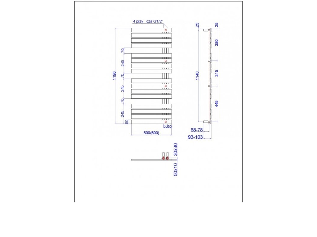 - 500 × 1190 mm, výkon 512 W, topná tyč 600 W