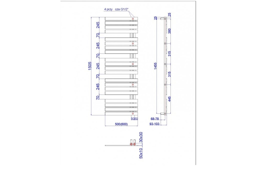 - 500 × 1505 mm, výkon 629 W, topná tyč 600 W