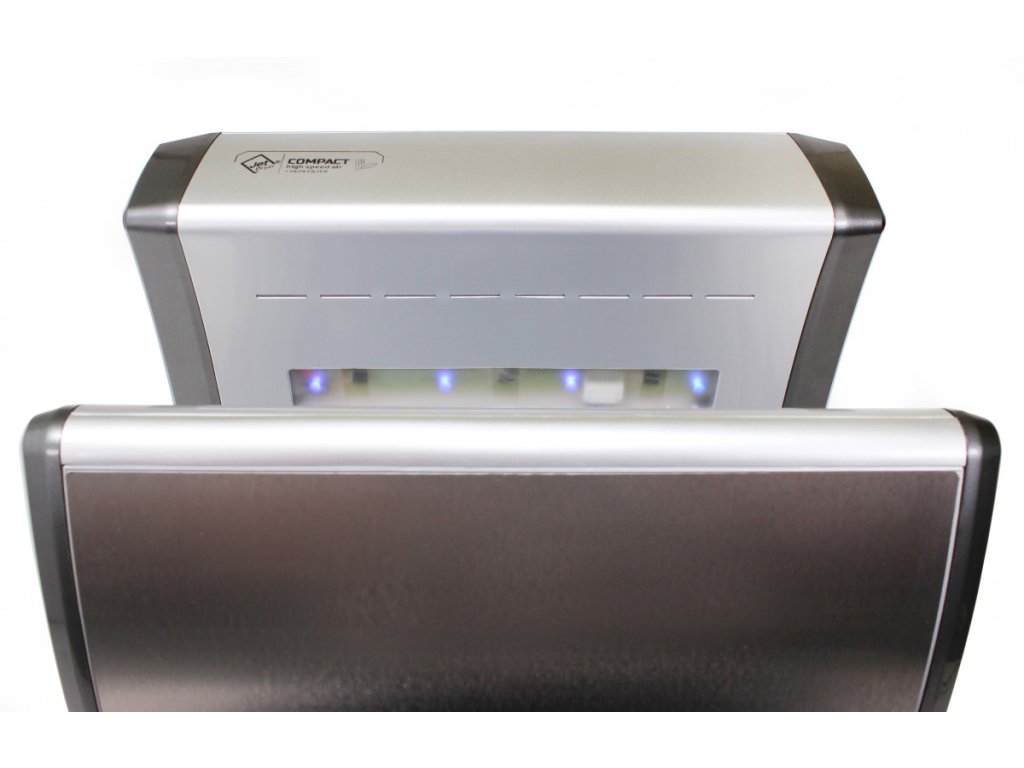 Jet Dryer COMPACT je malý tryskový vysoušeč vhodný především do umýváren limitovaných prostorem. Ve stříbrném provedení je přední panel vysoušeče z kovu, což zvyšuje jeho odolnost ve frekventovaných provozech. Vysoušeč rukou COMPACT je vybaven HEPA filtrem. Voda, která se při vysoušení neodpaří, je zachytávána v odkapové nádobce.