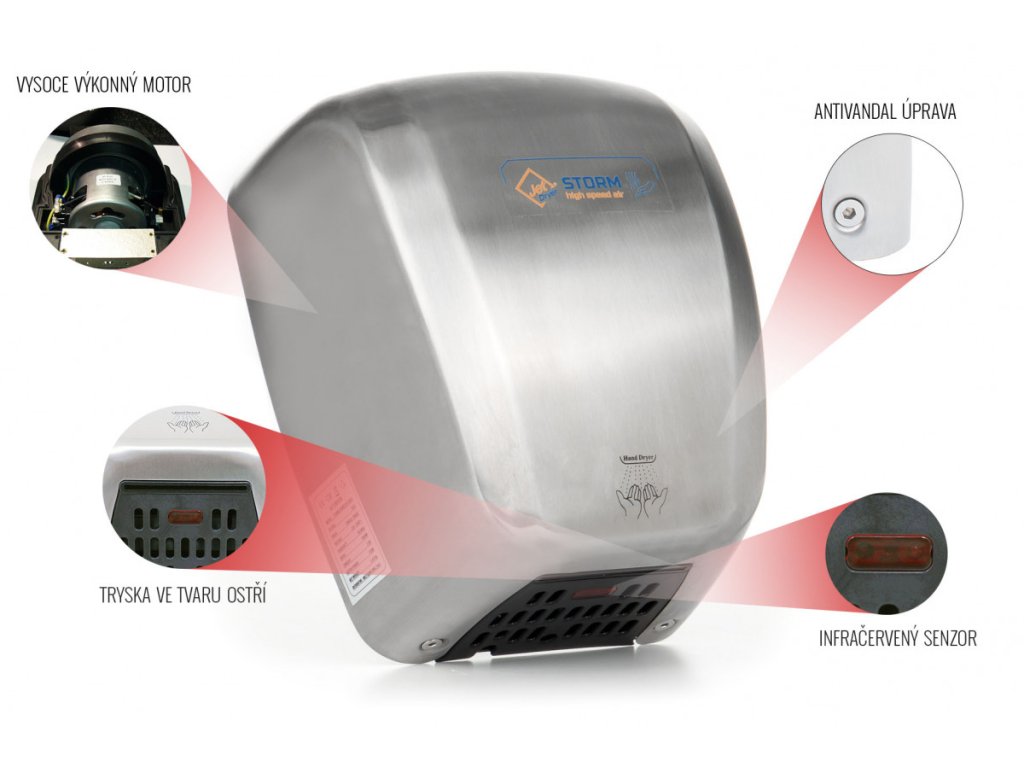 Nemusíte čekat dlouhé vteřiny, než se osoušeč nahřeje na plný výkon. Storm dosahuje provozní teploty prakticky ihned po vložení rukou.