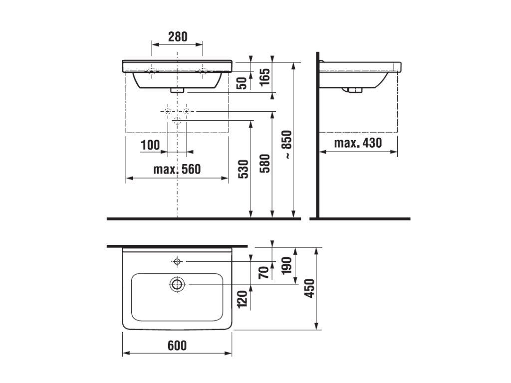 Závěsné umyvadlo 60 cm s otvorem pro baterii, s přepadem