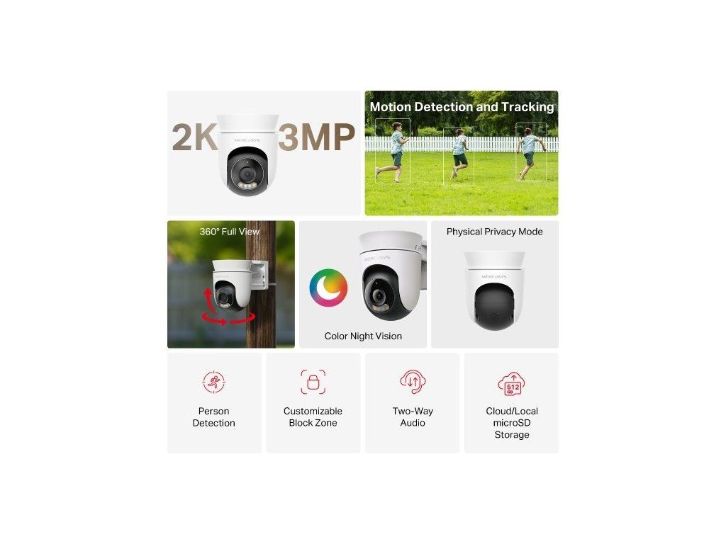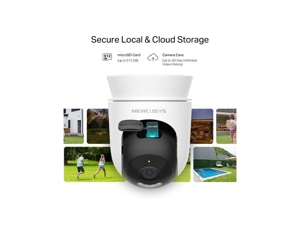 - Úložiště: microSD až 512 GB, cloud MERCUSYS Camera Care