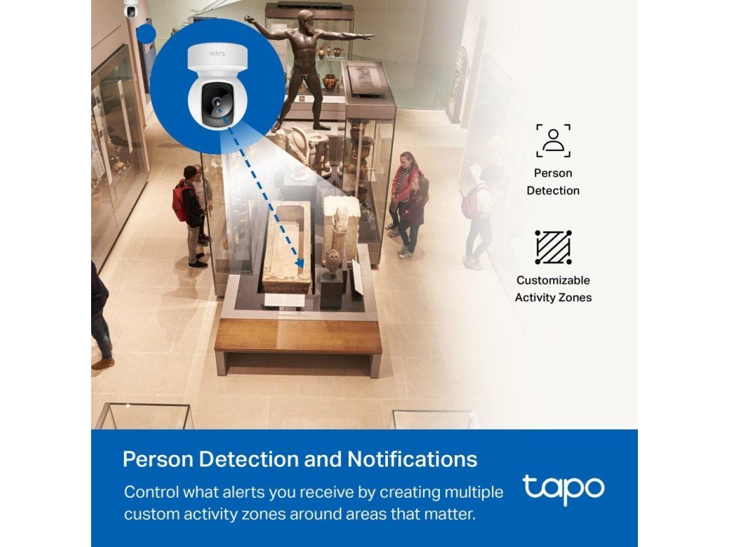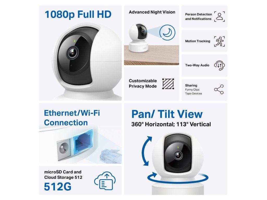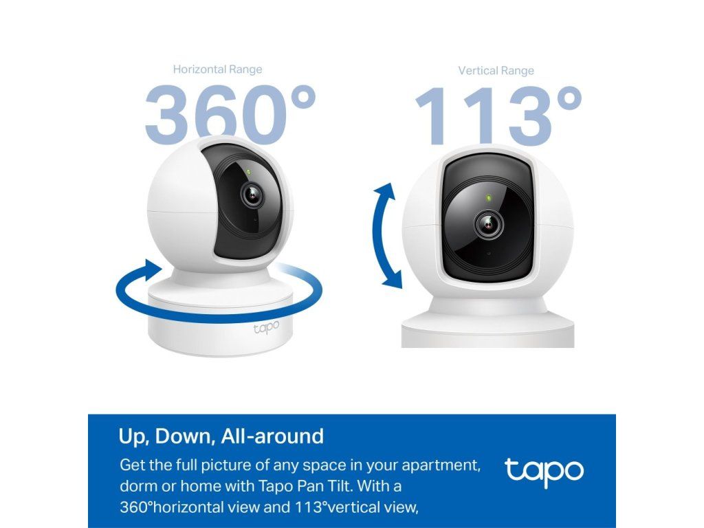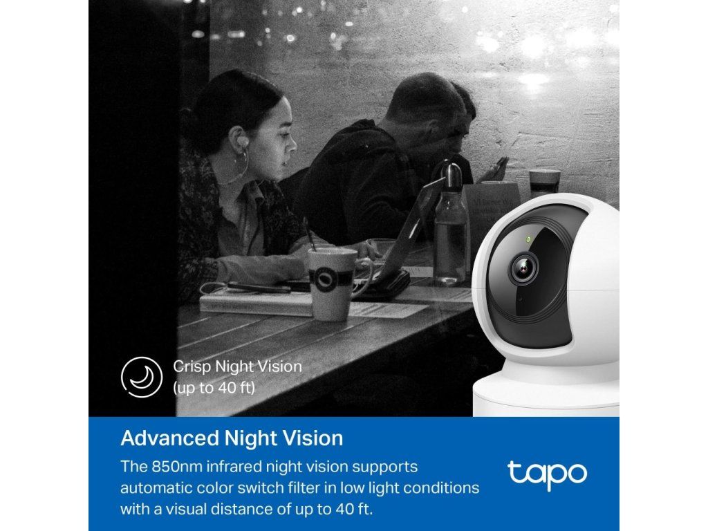 Wi-fi kamera TP-Link Tapo C202 zajistí bezpečí vaší domácnosti. Umožňuje 360° horizontální a 113° vertikální rotaci, natáčení, naklápění a zvládá pokročilé noční vidění. Během něj zaznamenává akci až na vzdálenost 12 metrů. Podporuje karty microSD (až 512 GB). 2megapixelový snímač pořizuje video záznam s vysokým Full HD rozlišením 1 080p.