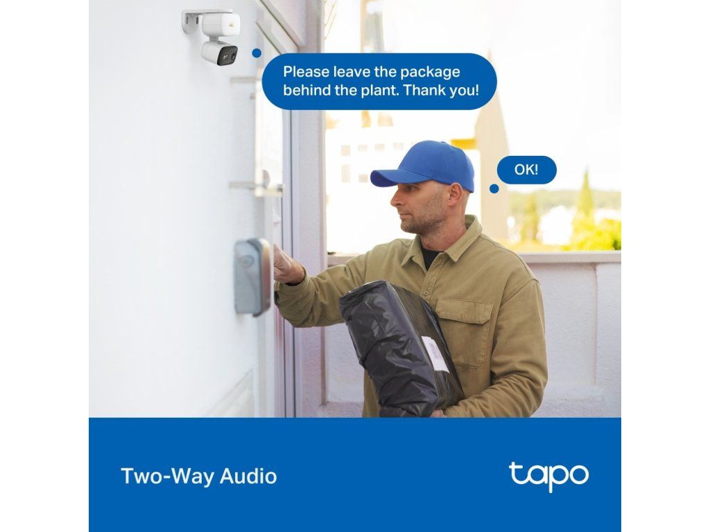 Vestavěný mikrofon a reproduktor umožňují obousměrnou komunikaci. Záznamy lze ukládat na microSD kartu s kapacitou až 512 GB nebo do cloudového úložiště Tapo Care. Šifrování AES a zabezpečení WPA/WPA2 zajišťují bezpečný přenos dat.