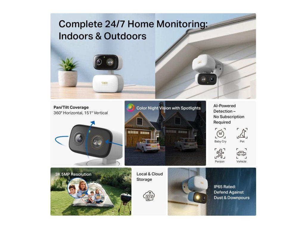 Wi-Fi bezpečnostní kamera TP-Link Tapo C236 nabízí detailní záznamy v rozlišení 3K 5MPx a inteligentní AI funkce pro spolehlivý dohled nad domácností. Díky 360° otáčení, nočnímu vidění a odolnosti IP65 poskytuje plnou kontrolu jak uvnitř, tak venku.