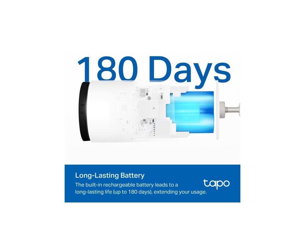 Baterie má velmi nízkou spotřebu a vydrží až 180 dní provozu na jedno nabití. Snadno ji dobijete. Také můžete využít solární panel Tapo A201 (není součástí balení), abyste si zajistili nepřetržitý chod.