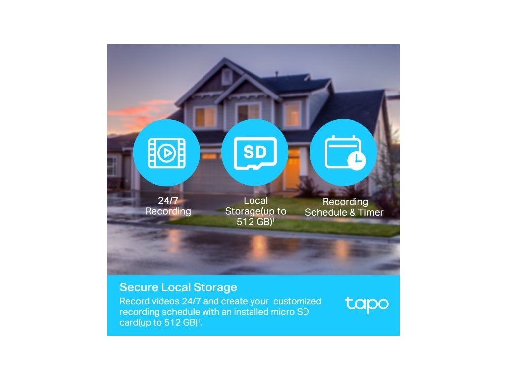 Jednotka Tapo C500 je vybavena paměťovým slotem, který podporuje microSD karty o maximální kapacitě až 512 GB. Dalším způsobem zálohy je cloudové úložiště Tapo Care, které poskytuje neomezený prostor pro vaše bezpečnostní záznamy. Nahrané video se uloží do cloudu na dobu 30 dnů a následně si jej můžete zpětně prohlédnout pomocí mobilní aplikace Tapo kdykoliv a kdekoliv. Získáte tedy stálý přístup k vašim záznamům, i když dojde k odcizení nebo odpojení kamerového systému.