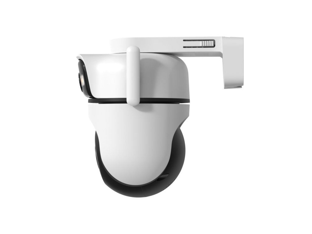 Horní širokoúhlý objektiv sleduje široký prostor (až 165°), zatímco spodní teleobjektiv nabízí až 10,8× digitální zoom pro detailní sledování. Obě čočky fungují synchronizovaně – při detekci pohybu se kamera automaticky natočí a sleduje cíl.