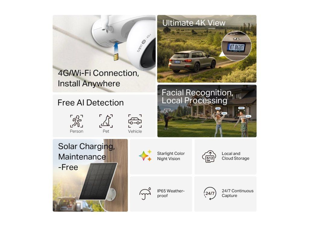 Solárně napájená bezpečnostní kamera TP-Link Tapo C665G KIT 4MPx s 4K rozlišením, Wi-Fi i 4G konektivitou vám poskytne svobodu i v místech bez elektřiny nebo internetu. Využijete ji na chatě, stavbě i na farmě – stačí vložit SIM kartu a můžete monitorovat, co se děje.