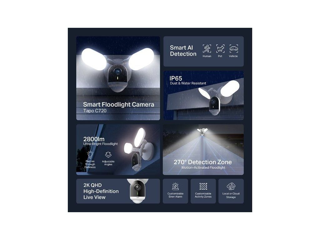 Zabezpečte svůj rodinný dům nebo firmu pomocí venkovní kamery TP-Link Tapo C720. Poskytne vám čistý obraz ve vysokém 2K QHD rozlišení a širokým zorným polem (150°). Zachytí celé okolí a zaznamená dění na vašem pozemku. Zároveň podporuje mnoho praktických funkcí, jako je například plnobarevné noční vidění, chytrá detekce pohybu, obousměrné audio nebo podpora hlasových asistentů Google Assistant a Amazon Alexa.