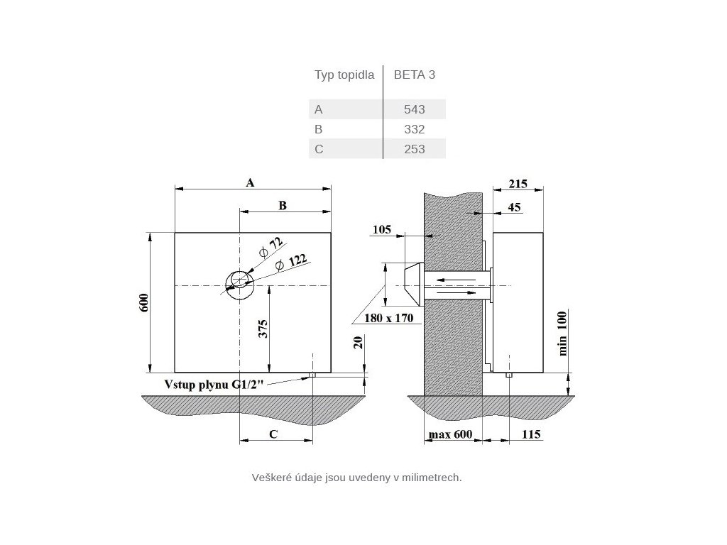 - odvod spalin je vyveden přes venkovní zeď otvorem o průměru 122 mm