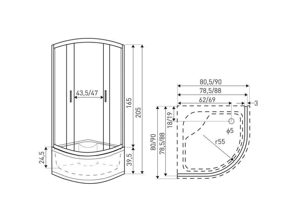 - lze použít se sprchovou vaničkou s rádiusem R55