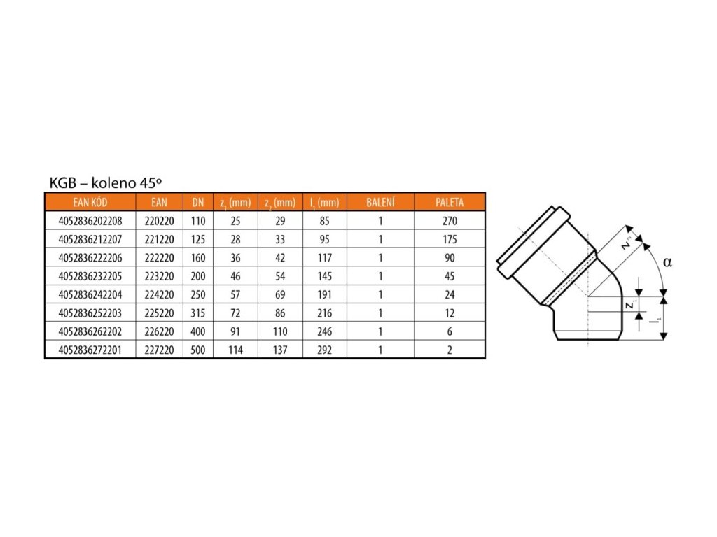 KG KGB koleno odpadní DN125, 45°, PVC, oranžová, 221220