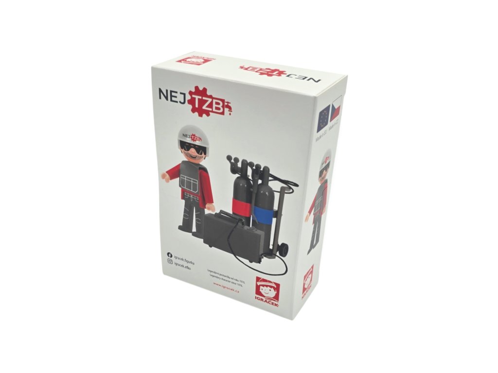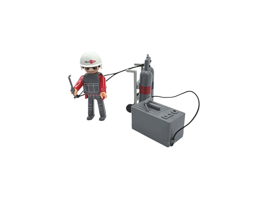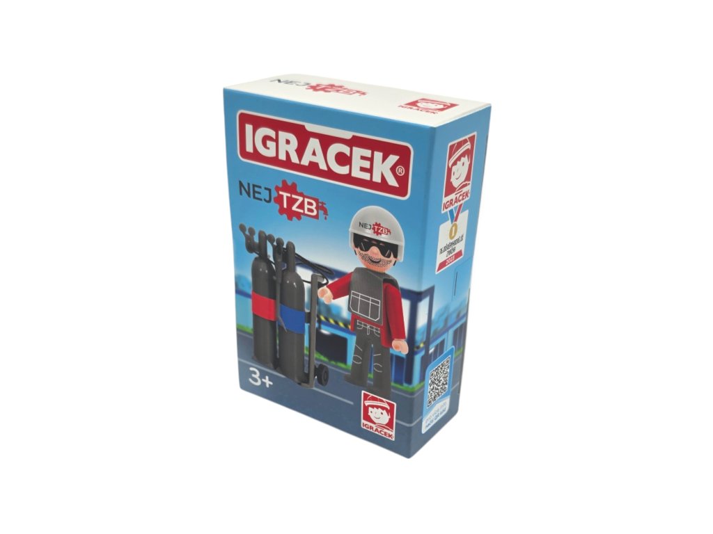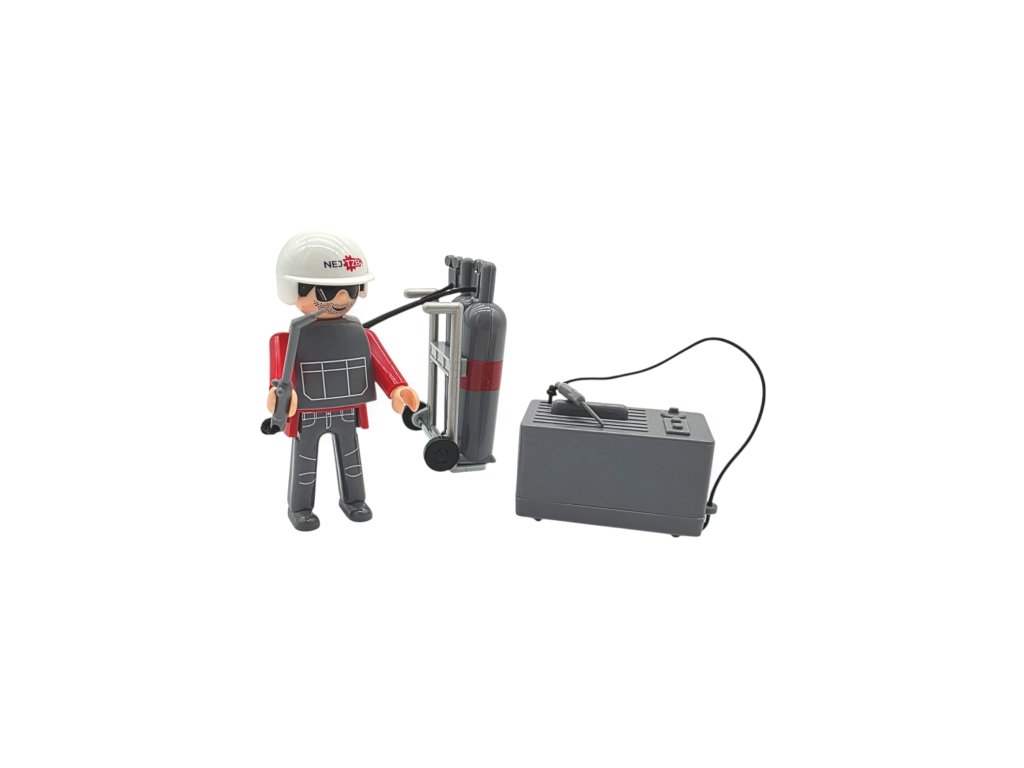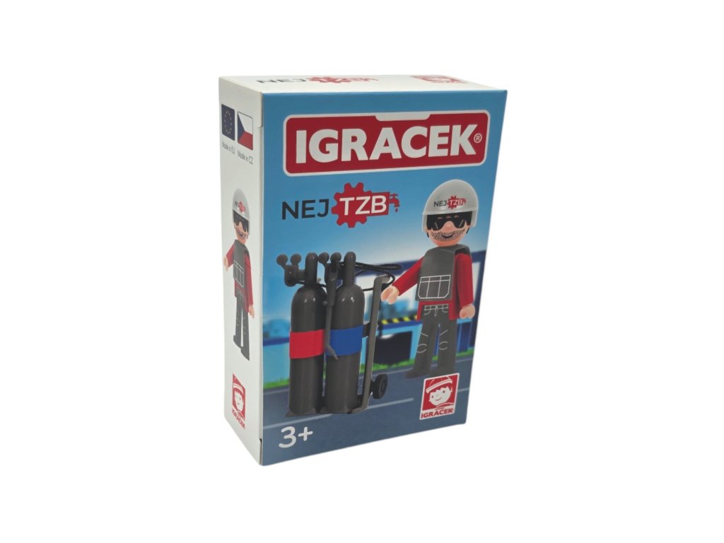 Vyrob si vlastní kotelnu. Igráček svářeč se svářecí soupravou je připraven vyrazit do práce.