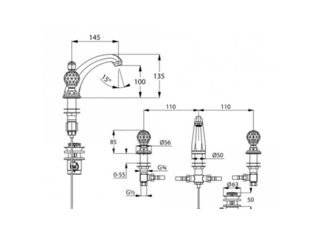 Tříotvorová umyvadlová baterie s krystalovými kohoutky, DN 15