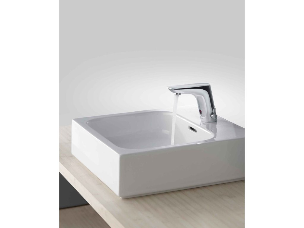 Senzorová stojánková umyvadlová baterie bez výpusti. V chromovém provedení. Průtok baterie je 8 litrů/minutu.