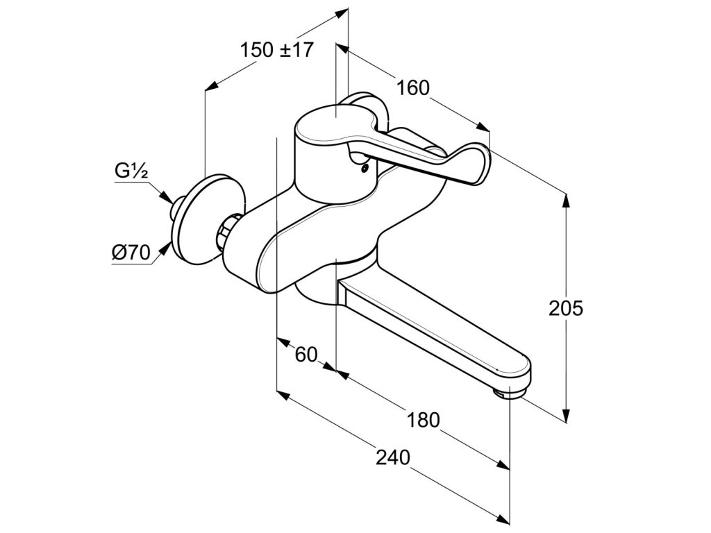 Páková nástěnná umyvadlová baterie bez výpusti. V chromovém provedení. Průtok baterie je 8 litrů/minutu. Rozteč baterie 150 mm.
