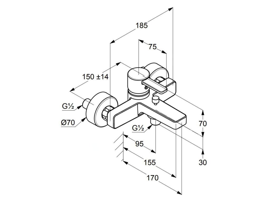 Páková nástěnná vanová baterie bez sprchového setu v chromovém provedení. Rozteč baterie 150 mm.