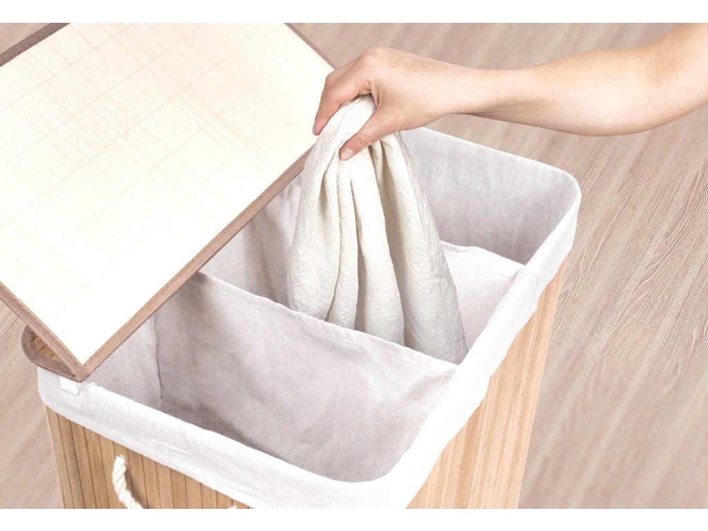 Bambusový koš G21 s pevným víkem má pratelnou látkovou vložku, rozdělenou na tři samostatné oddíly. Špinavé prádlo tak můžete třídit už před praním a umístit zvlášť kousky podle materiálu nebo barvy.