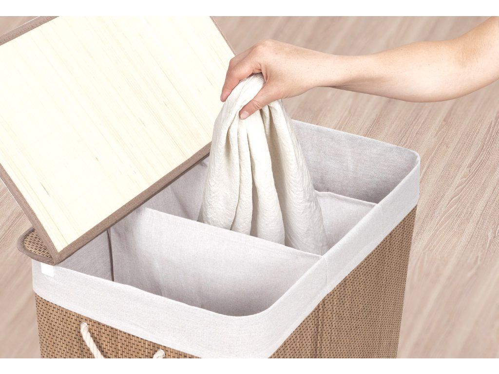 Bambusový koš G21 s pevným víkem má pratelnou látkovou vložku, rozdělenou na tři samostatné oddíly. Špinavé prádlo tak můžete třídit už před praním a umístit zvlášť kousky podle materiálu nebo barvy.