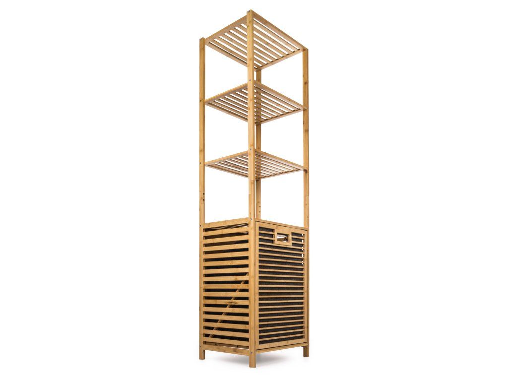 Praktický stojan se 4 policemi a výklopným košem na prádlo je skvělým řešením. Ušetří spoustu místa a uložíte do něj vše, co potřebujete. Potřeby na praní nebo kosmetiku, koupelnové vybavení a ručníky nebo úklidové prostředky. Každá z polic unese až 10 kg zátěže. Jedna z nich tvoří zároveň víko koše na špinavé prádlo s látkovou vložkou ve spodní části stojanu.