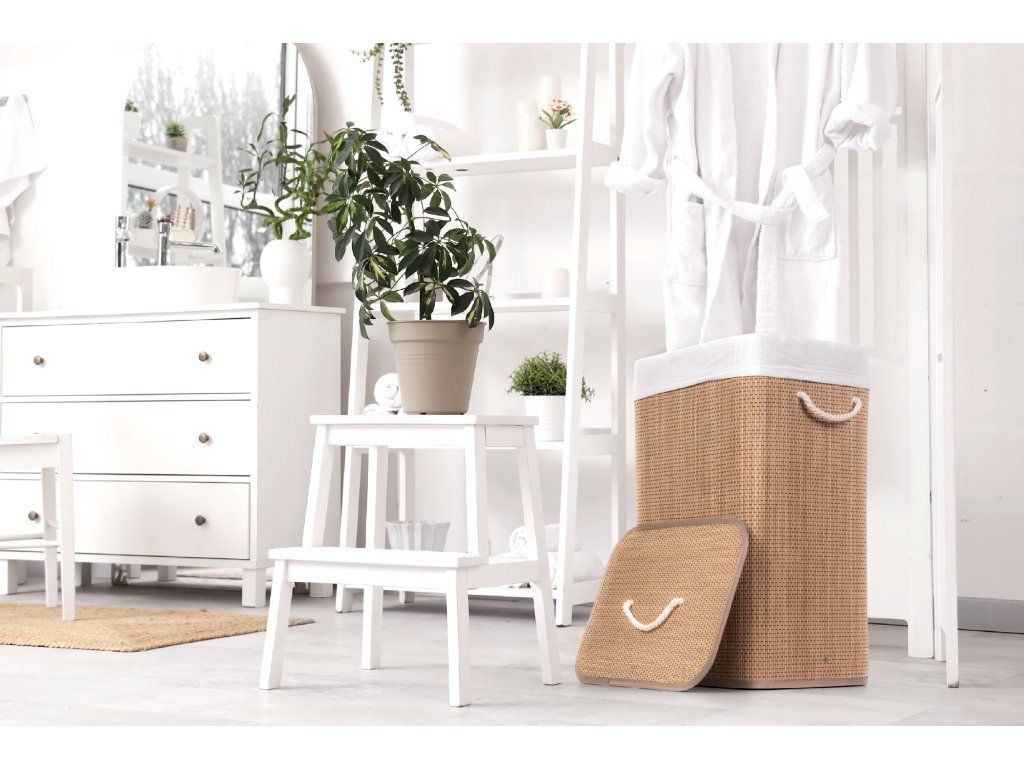 Jak vybrat nejlepší koš na špinavé prádlo? Co se materiálu koše týče, doporučujeme jednoznačně bambus. Je odolný vůči vlhkosti, takže jej můžete bez obav umístit do koupelny nebo servisní místnosti s pračkou. Zároveň je i vizuálně velmi příjemný – kombinace přírodního materiálu a bílé vložky a madel evokuje pocit čistoty, navíc se i hodí k jakémukoliv interiéru.