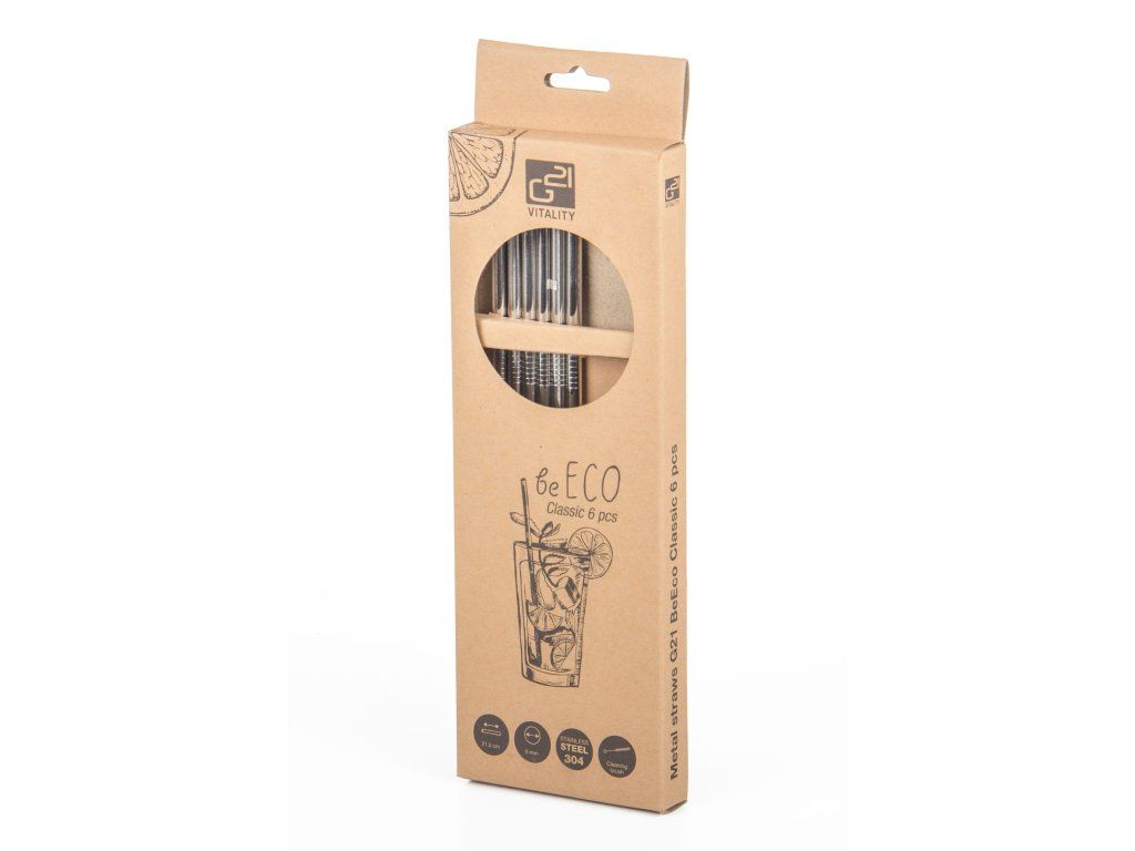 Pořiďte si elegantní, odolné, stylové a především ekologické slámky na pití z nerezu. V sadě najdete 6 nerezových brček G21 BeEco Classic o průměru 6 mm a délce 21,5 cm a kartáček na čištění. V nabídce máme i brčka zahnutá, prohlédnout si je můžete zde.
