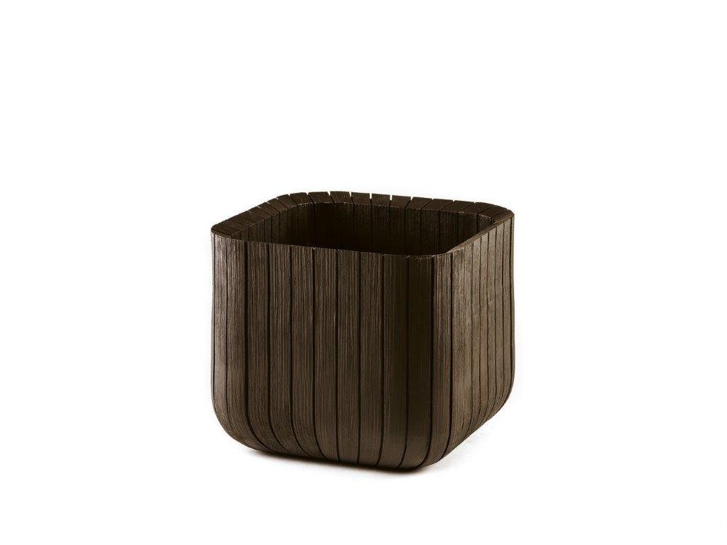 Květináč Keter Cube Planter M v elegantní hnědé barvě zaujme věrnou imitací přírodního dřeva a odolnou konstrukcí z lisovaného plastu. Díky objemu 50,5 litru se hodí pro pěstování větších rostlin na zahradě, terase i balkonu.