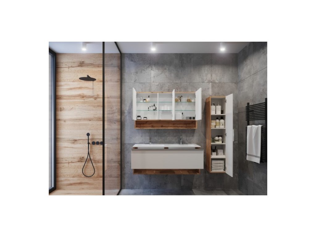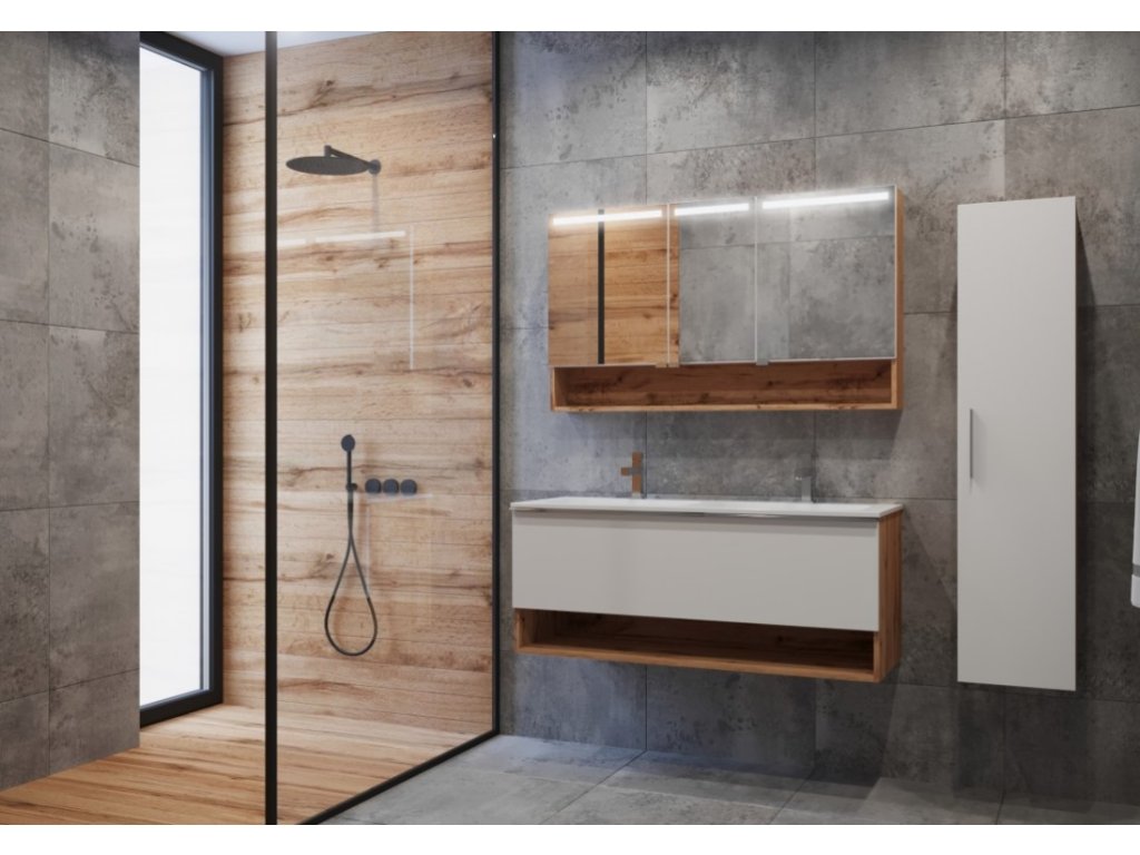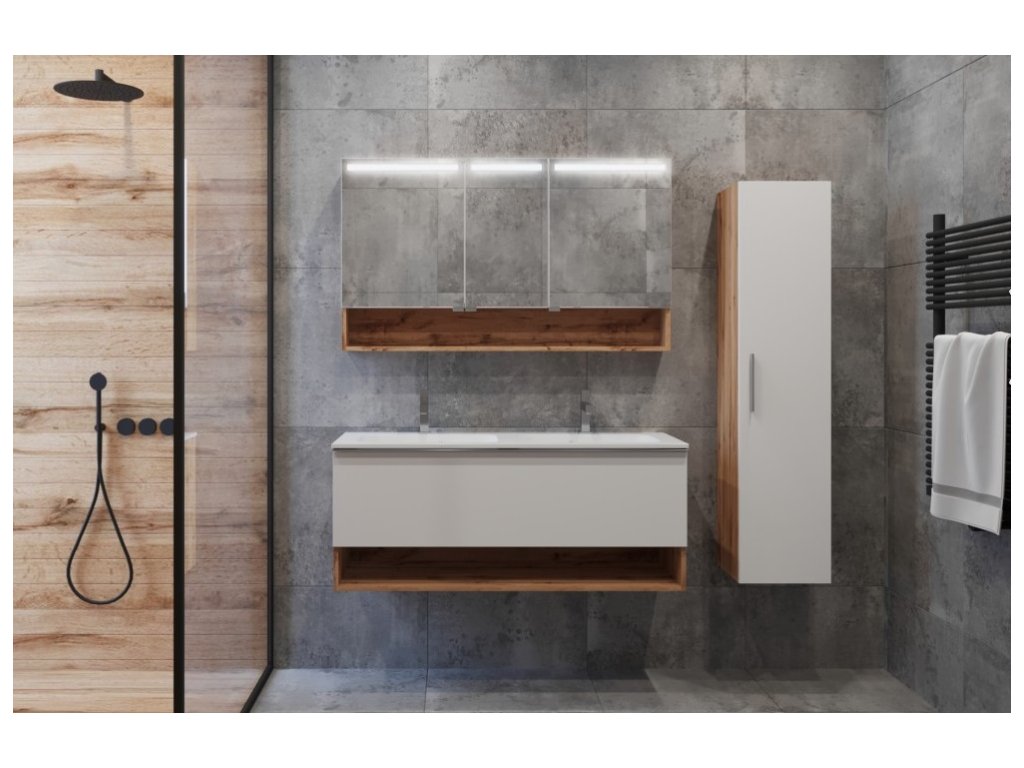 Designová galerka s osvětlením v matné barvě dubu s praktickým vnitřním členěním. Spolu s ostatním nábytkem ze série Domus doplní Vás prostor v koupelně na jedničku. Splní veškeré Vaše očekávání. Tento nábytek je designová a luxusní záležitost, proto Vám doporučujeme doplnit Vaší koupelnu právě tímto vysoce kvalitním nábytkem.