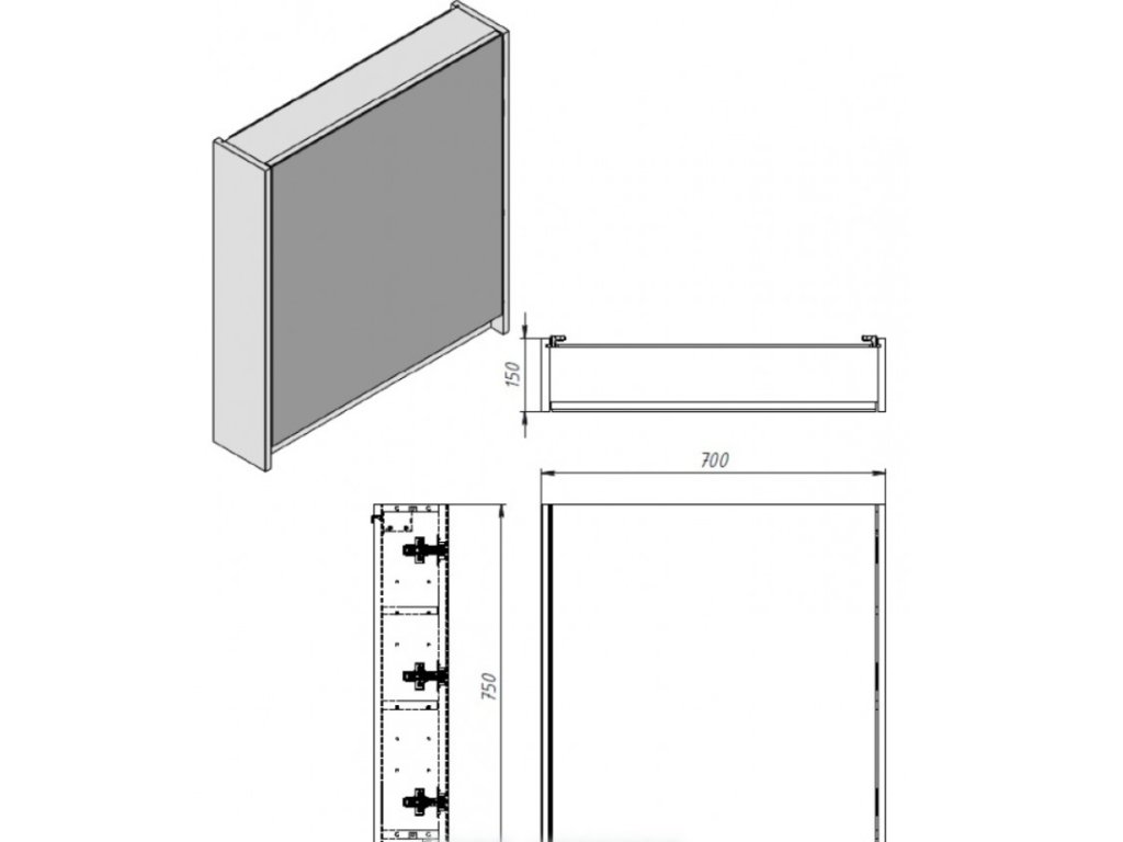 Kostra a přední části zrcadlové skříňky jsou vyrobeny z laminované dřevotřísky o tloušťce 16 mm. Zvenčí je povrch zrcadlové skříňky natřen lesklým bílým emailem. Výška zrcadlové skříňky je 75 cm, šířka 70 cm a hloubka 15 cm. Zrcadlová deska je k podstavci přilepena elastickým lepidlem, které nepoškozuje amalgám a zajišťuje bezpečné uchycení. Zrcadlová tkanina je nalepena na vnější straně dvířek. Zrcadlová skříňka má jednu přihrádku s jedněmi dvířky, prostor za nimiž je rozdělen dvěma policemi z dřevotřísky o tloušťce 16 mm. Police lze výškově nastavit. Dveře jsou zavěšeny na závěsech se systémem soft-close, které zajišťují hladké a měkké zavírání. Zrcadlová skříňka je bez LED osvětlení v případě potřeby lze samostatně zakoupit chromovanou LED lampu z naší nabídky a nainstalovat ji na horní část zrcadlové skříňky. Zrcadlová skříňka má regulované úchytky pro zavěšení.