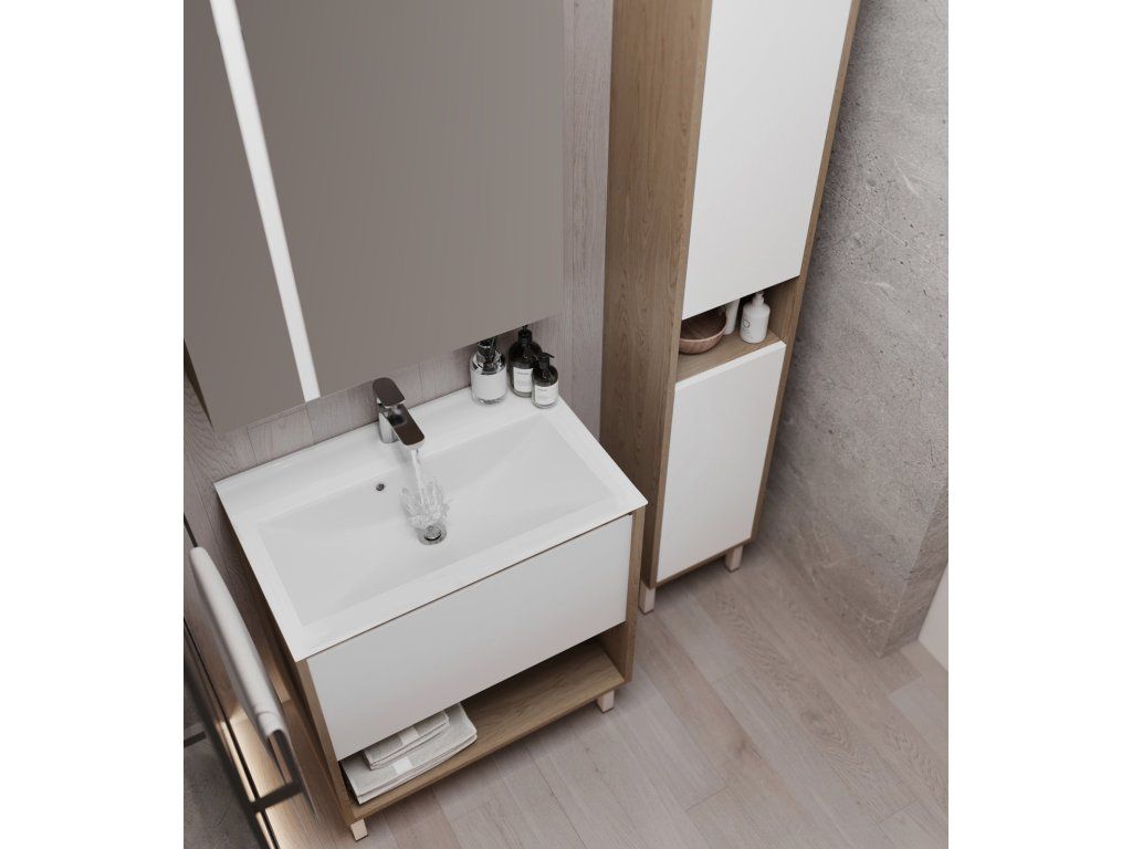 Představujeme Vám luxusní koupelnový nábytek, který zaujme především svým zajímavým provedením. Tato naprosto designová skříňka s umyvadlem by rozhodně neměla chybět v žádné moderní stylové koupelně. Boční strany skříňky a celá konstrukce jsou vyrobeny z MDF desky o tloušťce 16mm. Umyvadlo, které je součástí skříňky, je vyrobeno z vysoce kvalitního a oblíbeného litého mramoru. Povrchová úprava je řešena bílou barvou a dekorem dřeva. Velikou výhodou této skříňky je její soft close dovírání, díky kterému bude užívání skříňky naprosto pohodlné. Pociťte výhody a úložný prostor, který Vám tato skříňka dopřeje.
