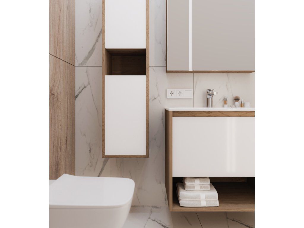 Představujeme Vám luxusní koupelnový nábytek, který zaujme především svým zajímavým provedením. Tato naprosto designová skříňka s umyvadlem by rozhodně neměla chybět v žádné moderní stylové koupelně. Boční strany skříňky a celá konstrukce jsou vyrobeny z MDF desky o tloušťce 16mm. Umyvadlo, které je součástí skříňky, je vyrobeno z vysoce kvalitní keramiky. Povrchová úprava je řešena bílou barvou a dekorem dřeva. Velikou výhodou této skříňky je její soft close dovírání, díky kterému bude užívání skříňky naprosto pohodlné. Pociťte výhody a úložný prostor, který Vám tato skříňka dopřeje.