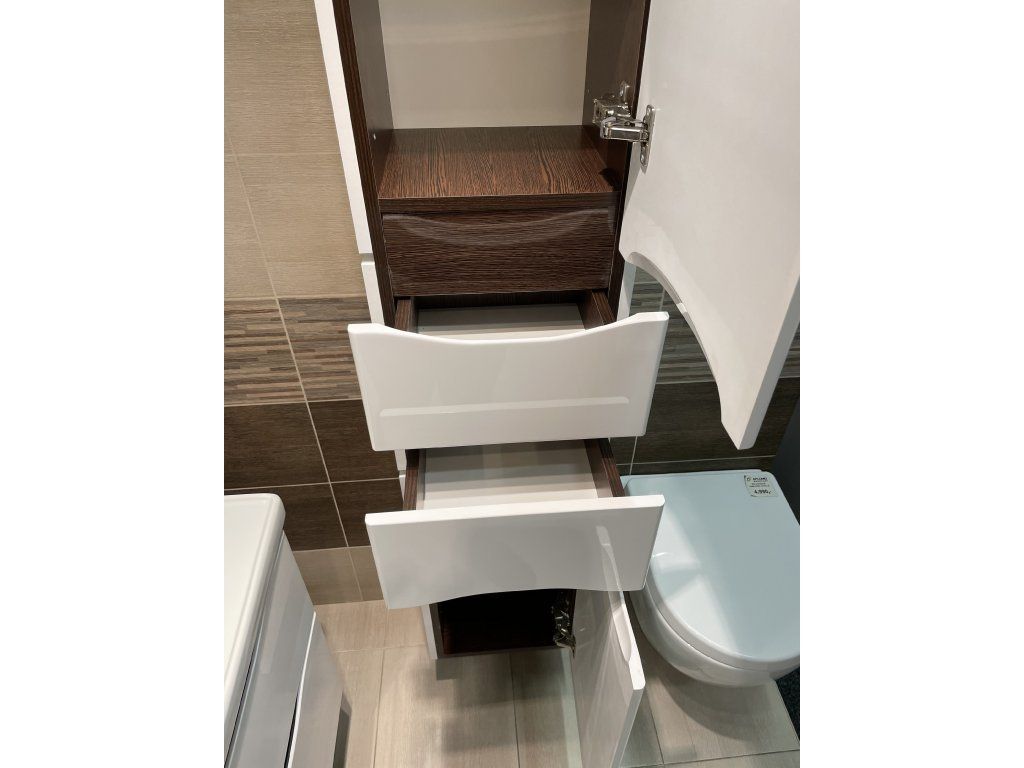 Nádherné řešení koupelnového sloupku, dodá koupelně opravdu na luxusním vzhledu, který především podporuje kombinace vysokého bílého lesku s lehkými detaily dekoru dřeva. Výhodou jsou lakované MDF desky, kdy zde není prostor pro riziko možného odlepení, jak se může stát při lepených. Řešení skrytých úchytů zabraňuje pocitu rušivých elementů, na které může být náročnější zákazník citlivý. Soft close dovírání ochrání šuplíky a dvířka před zvukově nepříjemným boucháním a odíráním se při zavírání.