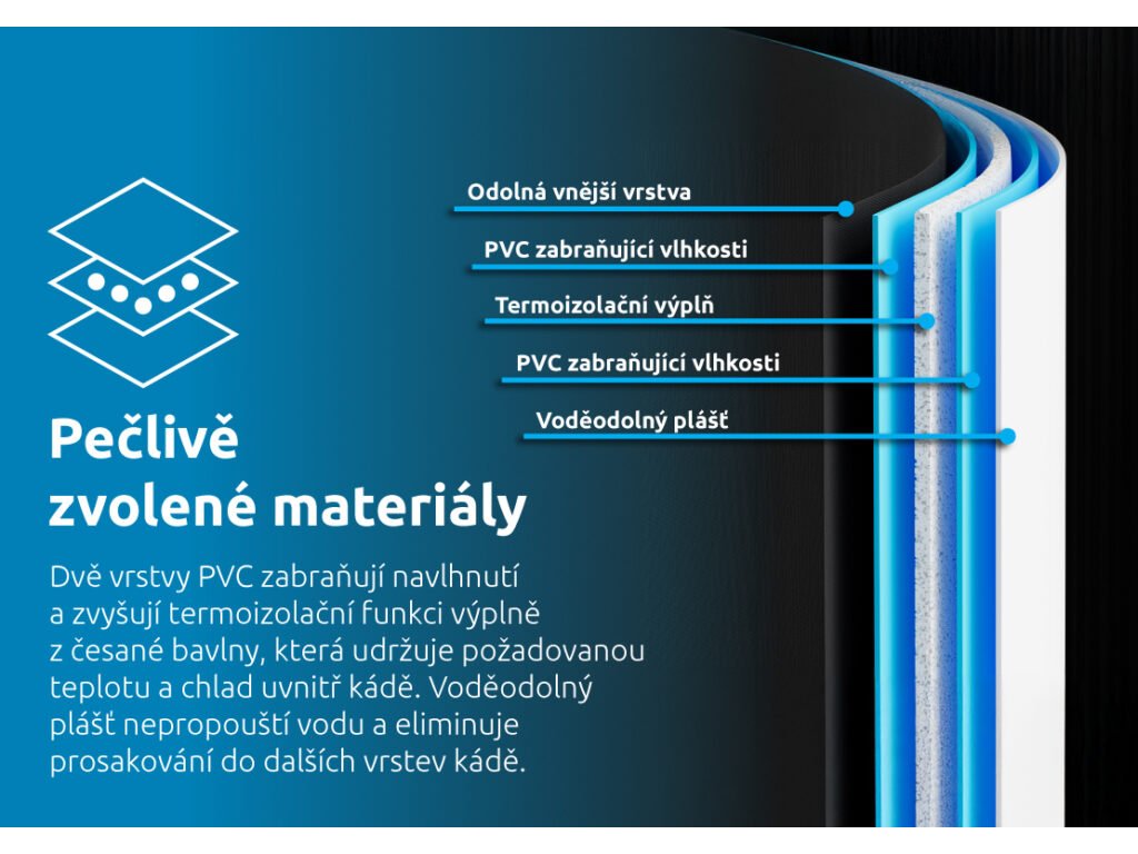 Stěny jsou vyrobeny z několika vrstev: odolná vnější vrstva z polyesteru a nylonu, PVC zabraňující vlhkosti, termoizolační výplň z česané bavlny, další vrstva PVC zabraňující vlhkosti a vodeodolný vnitřní plášť.