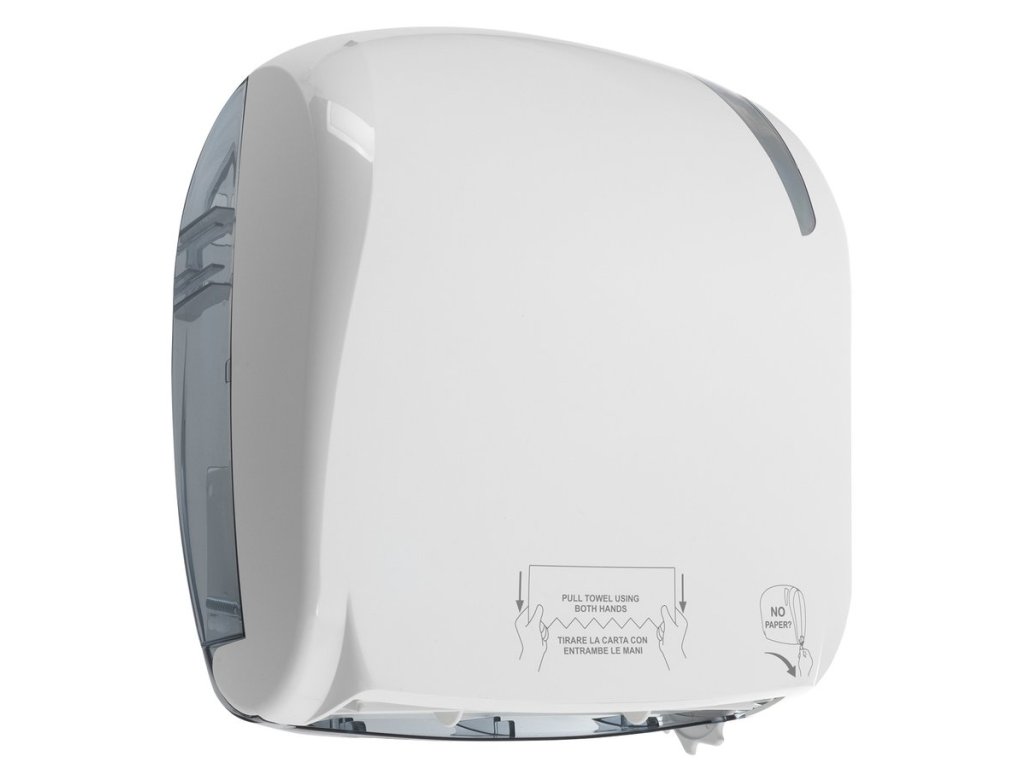 Plastový zásobník na papírové ručníky v roli s automatickým ořezem. Výkonný řezací mechanismus umožňuje plynulé dávkování po jednom útržku. Velká kapacita snižuje nutnost častého doplňování. Ideální pro rušné toalety např. ve školách, továrnách nebo na letištích.