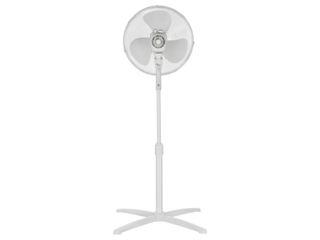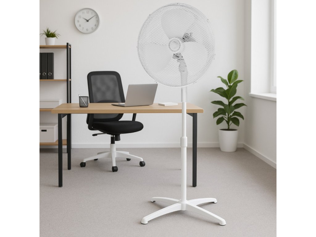 - Bílý stojanový ventilátor o průměru 16 palců (40 cm)